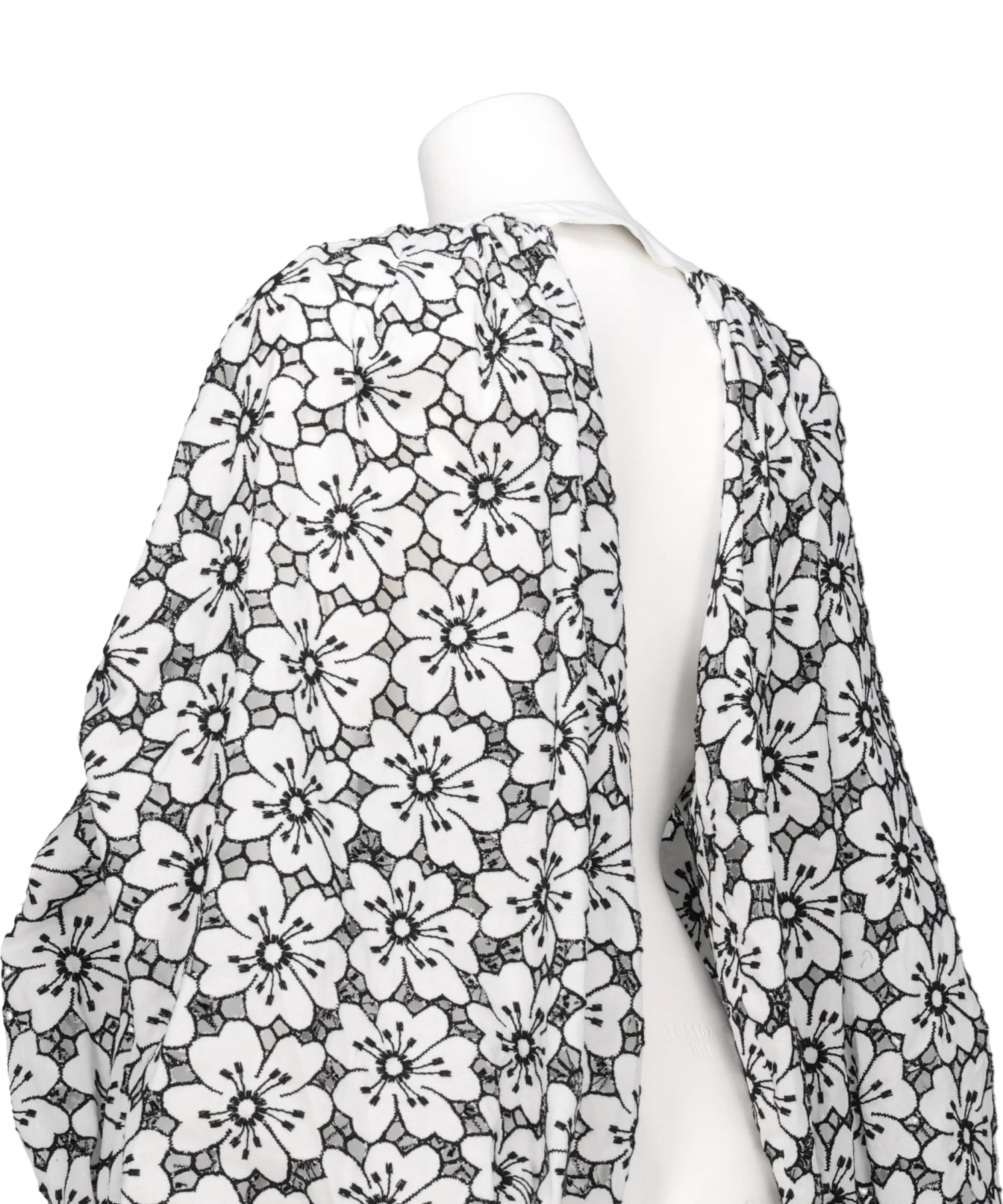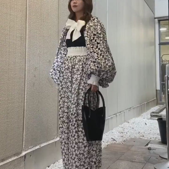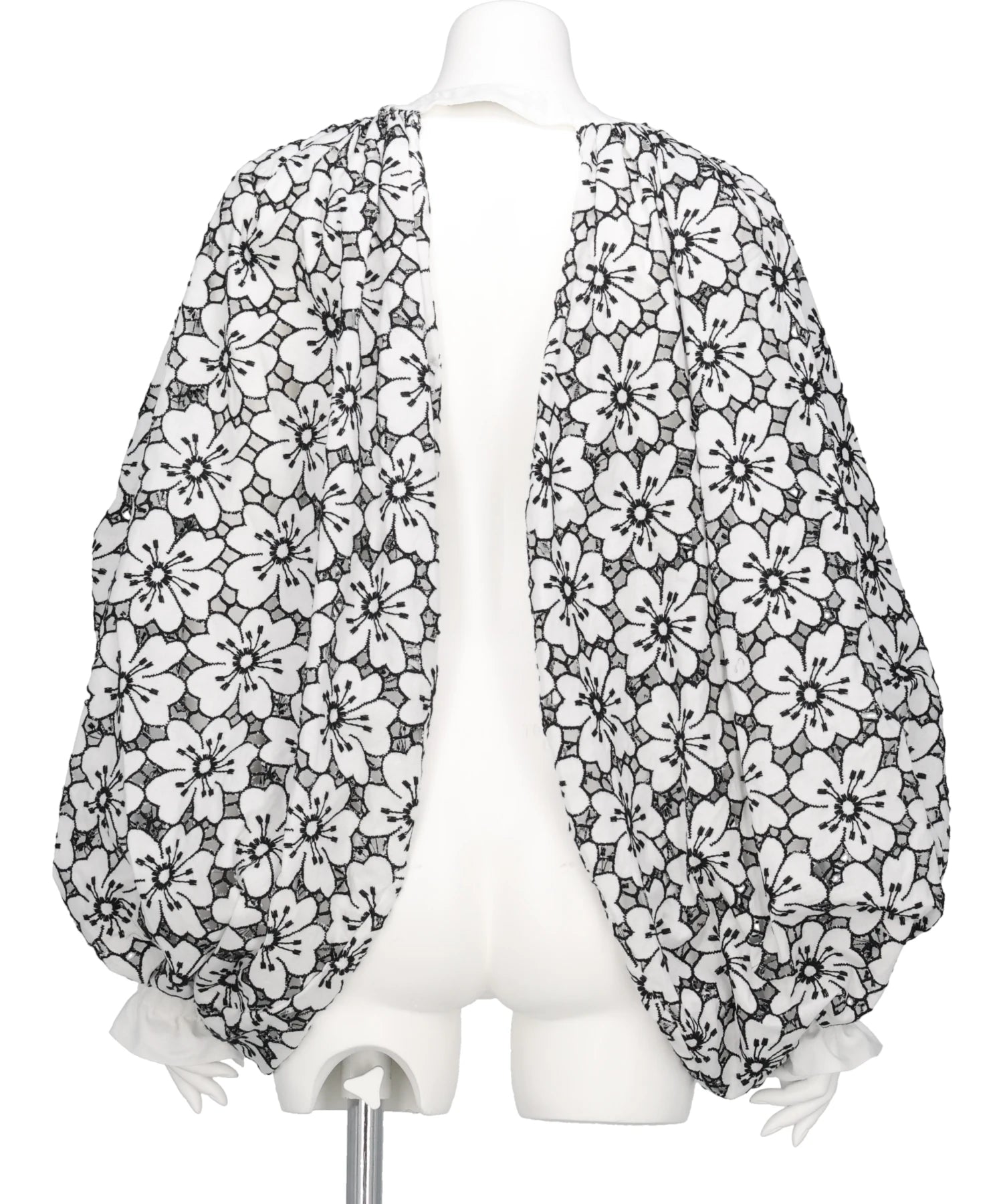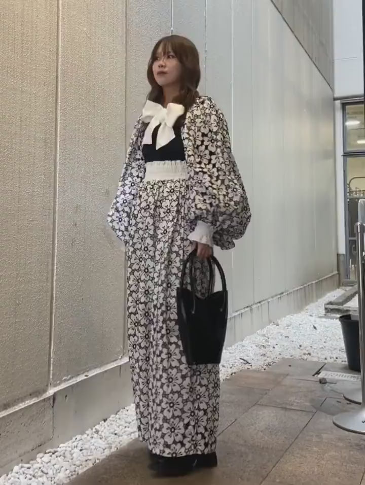 大きく膨らんだバルーンスリーブが目を引く、コットンレース素材のオープンフロントジャケット。白地に黒のフラワーモチーフが全面に広がるモノトーンレースは、上品でありながら存在感抜群。袖口はスモッキングとフリルで繊細に仕上げ、シンプルなインナーと合わせるだけで一気に華やかなスタイルが完成します。特別なお出かけはもちろん、デイリーのコーディネートにも取り入れやすいモノトーンカラーが嬉しい一枚です。