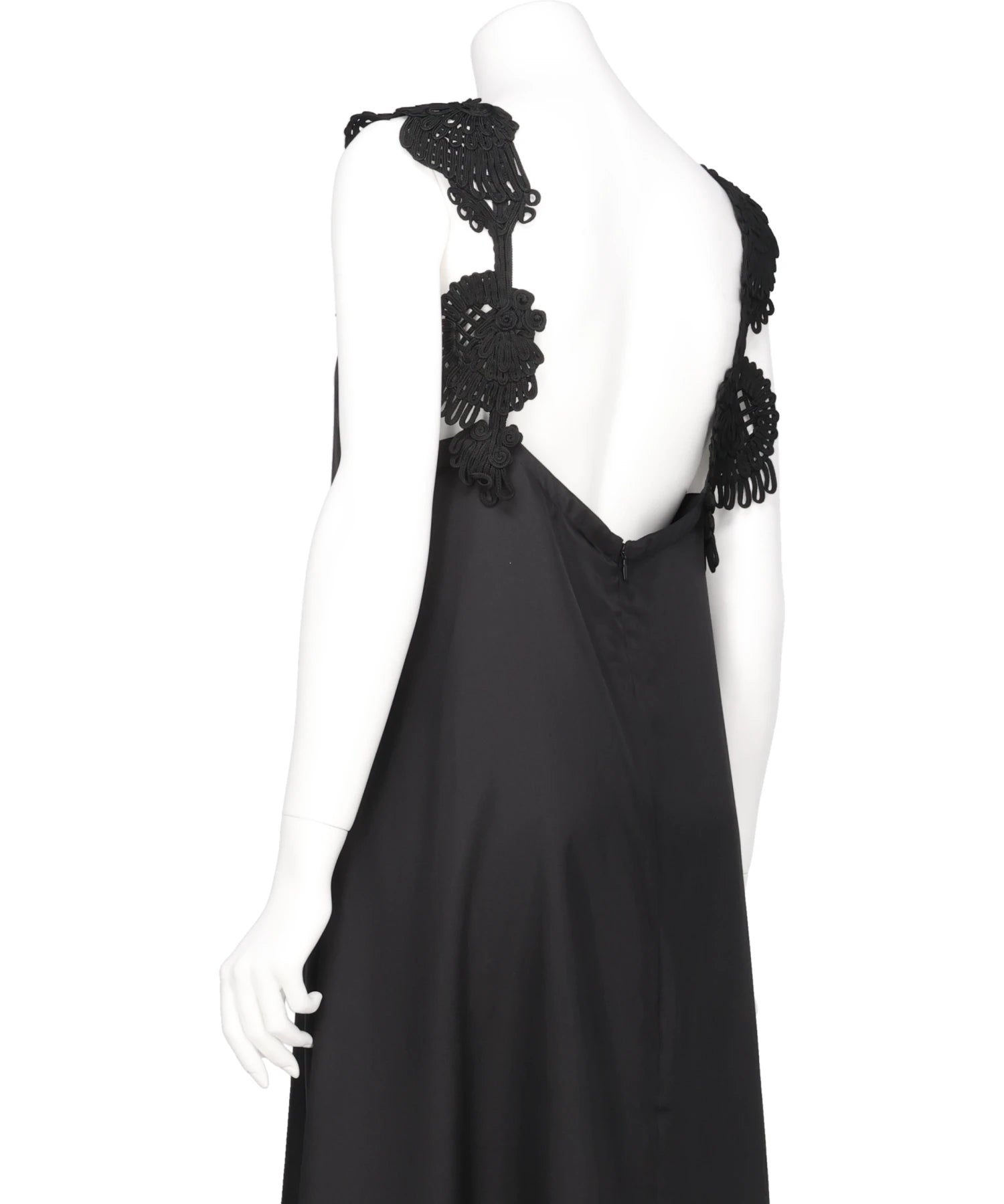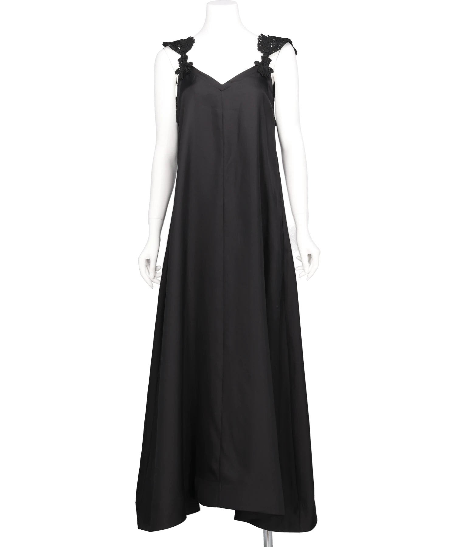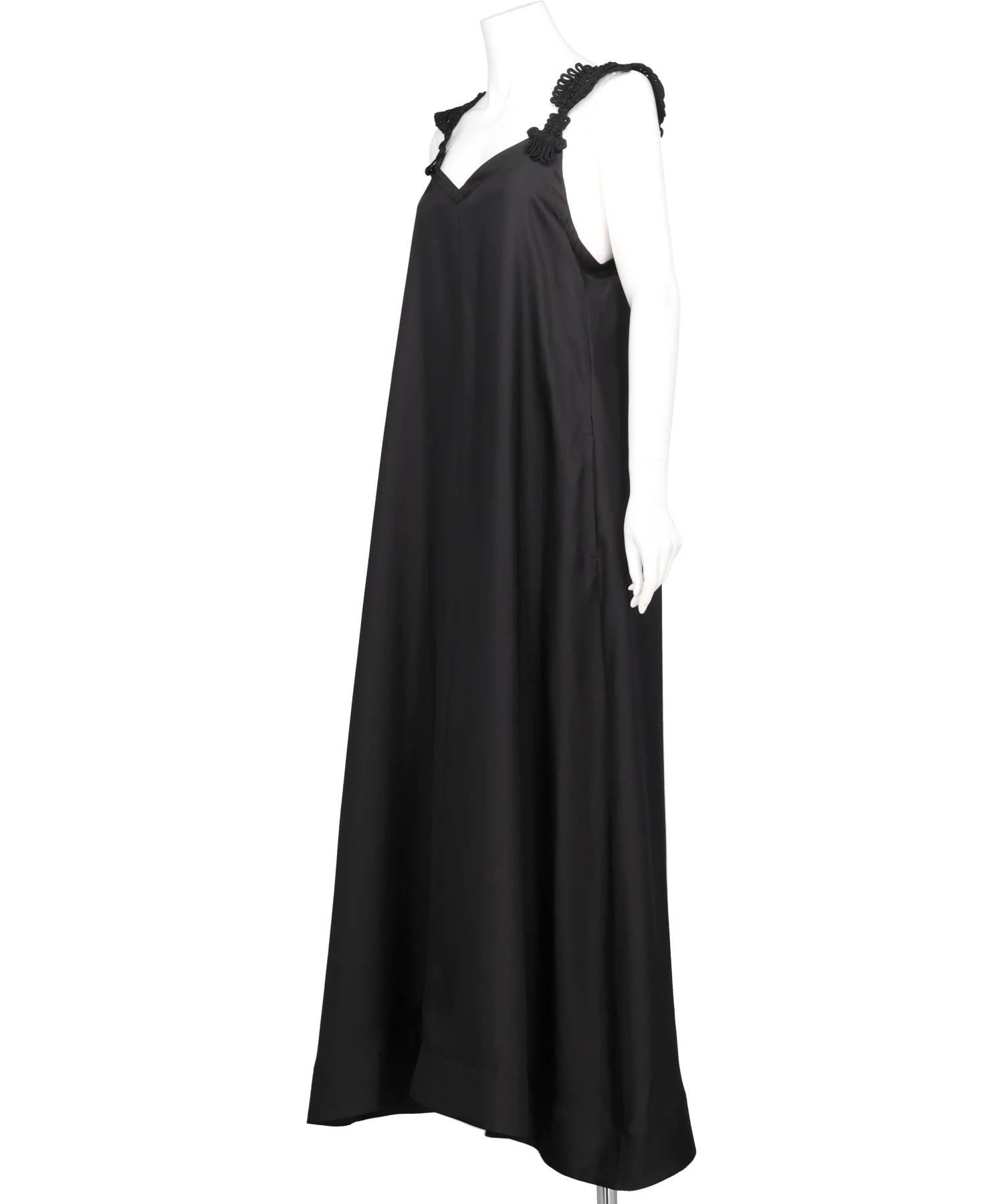 肩元にコード刺繍を施したデザインが、シンプルなブラックのドレスに繊細な表情を宿す一着。