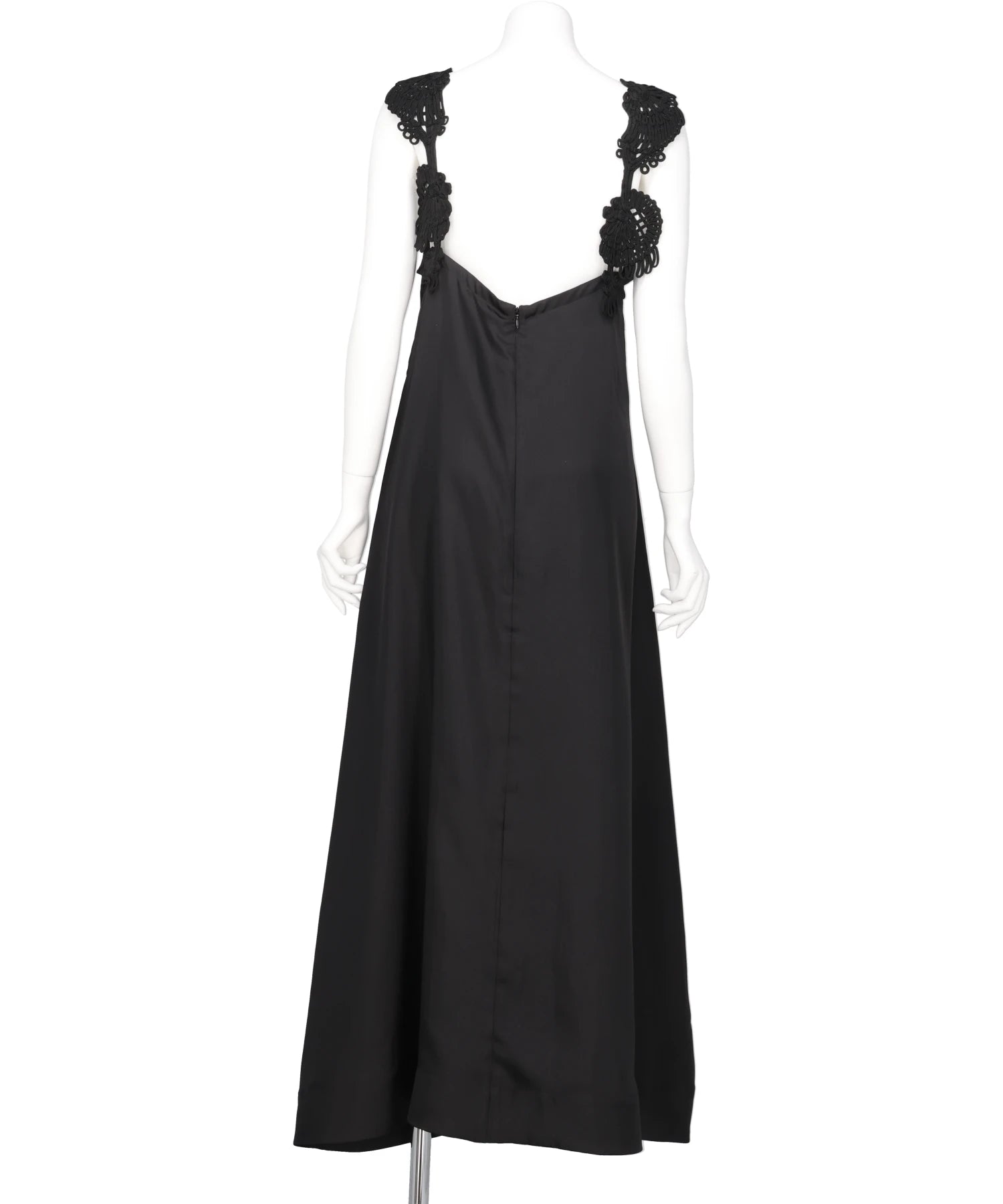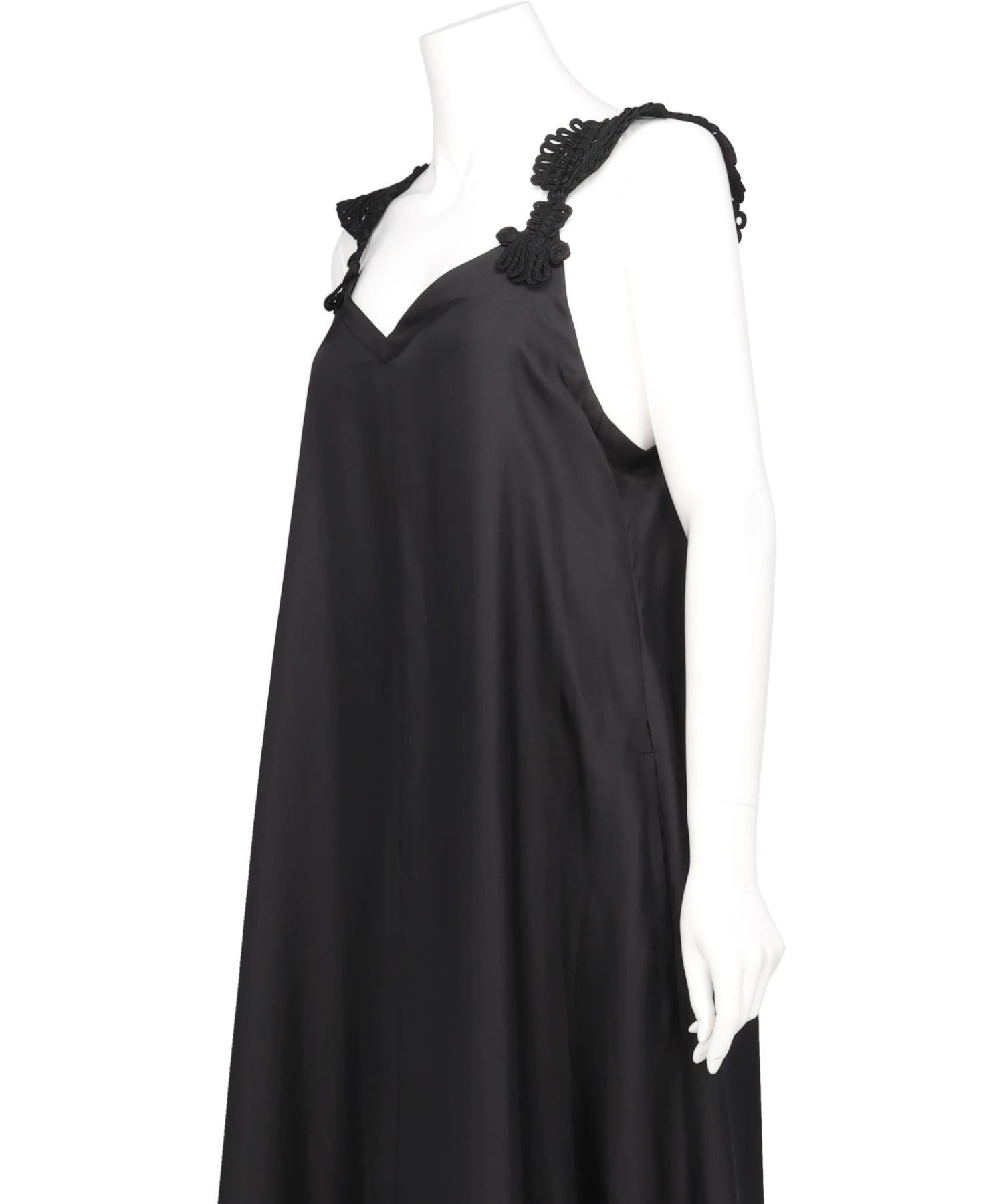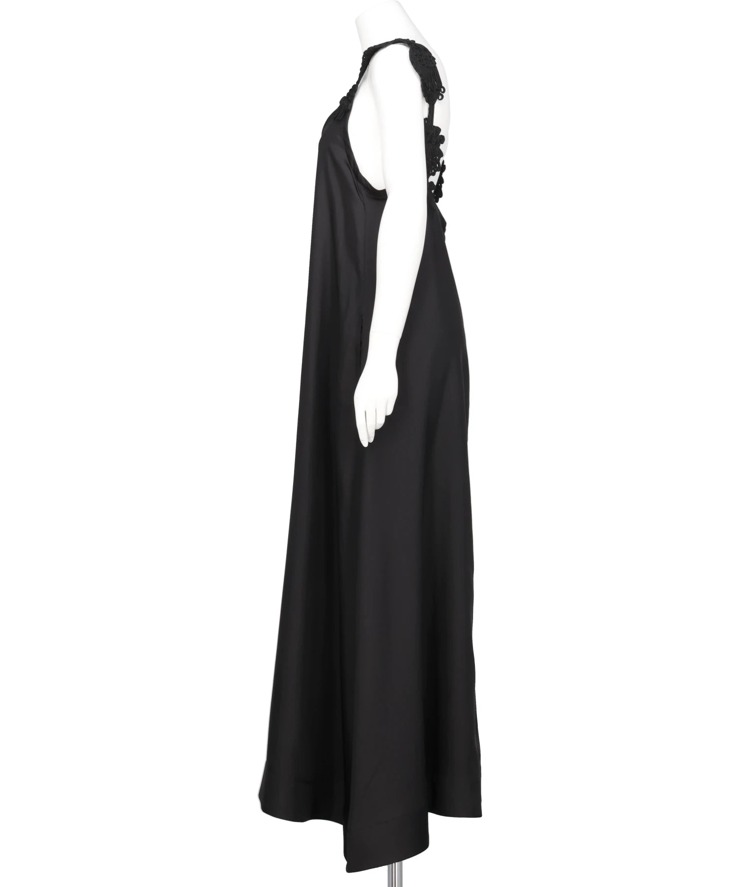 肩元にコード刺繍を施したデザインが、シンプルなブラックのドレスに繊細な表情を宿す一着。