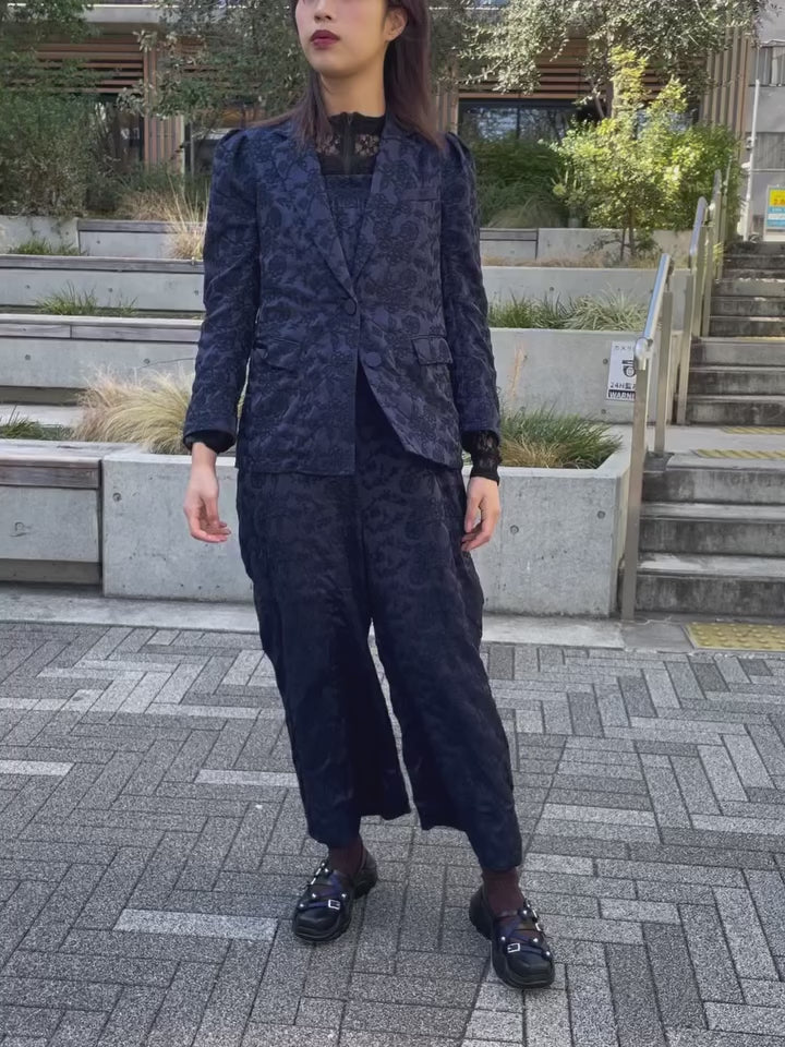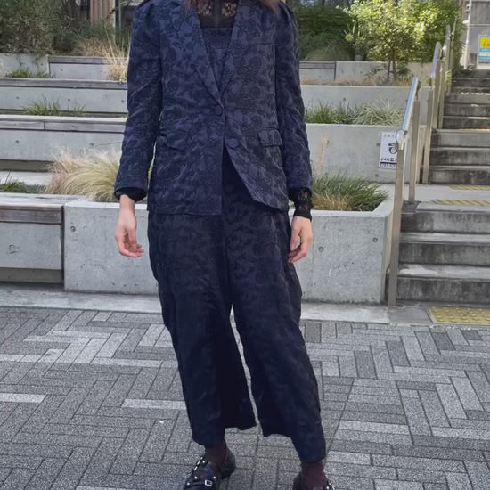 全面に施されたペイズリー柄の刺繍が、ネイビー×ネイビーのトーンオントーンで上品な奥行きを生み出すオールインワン。