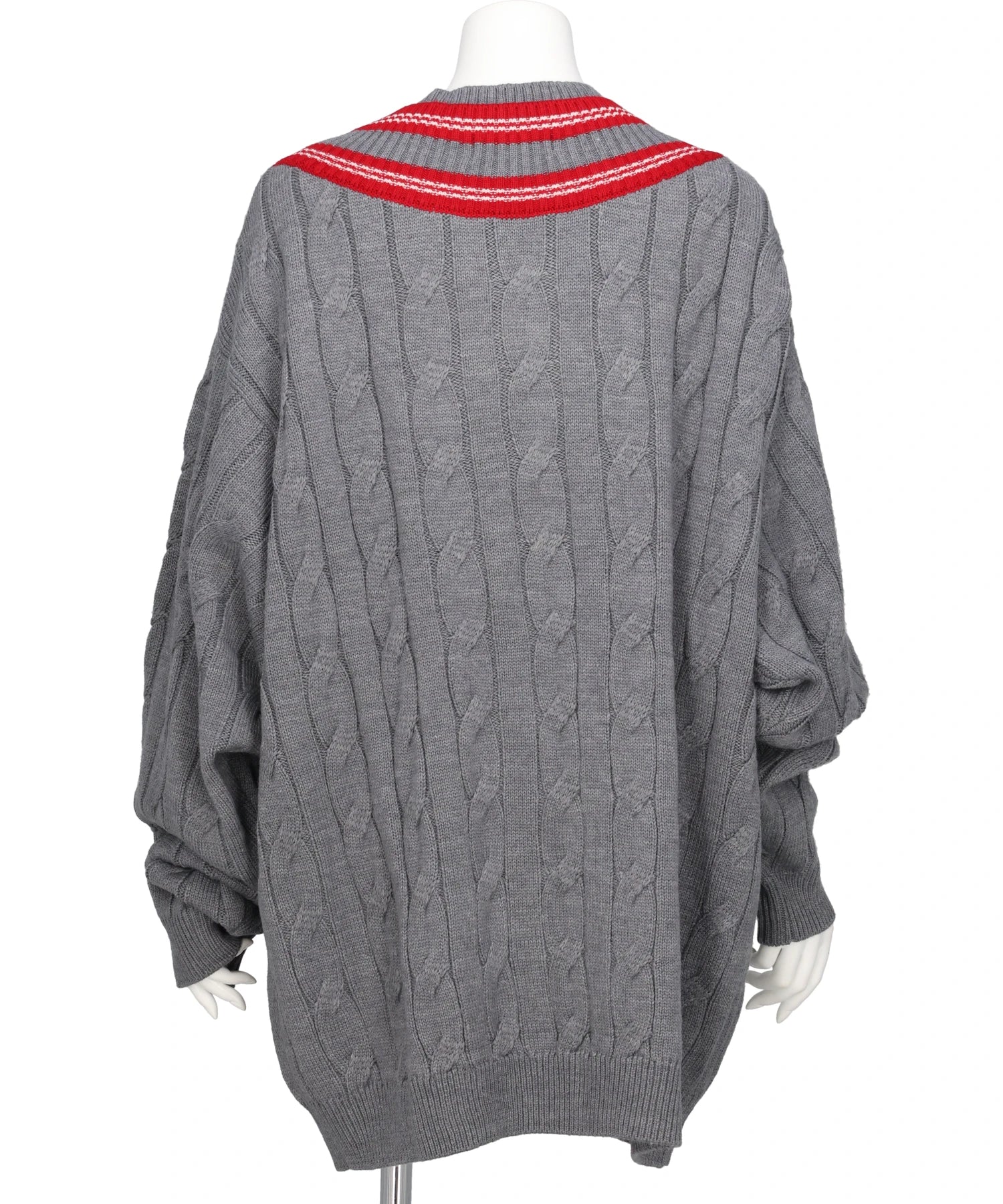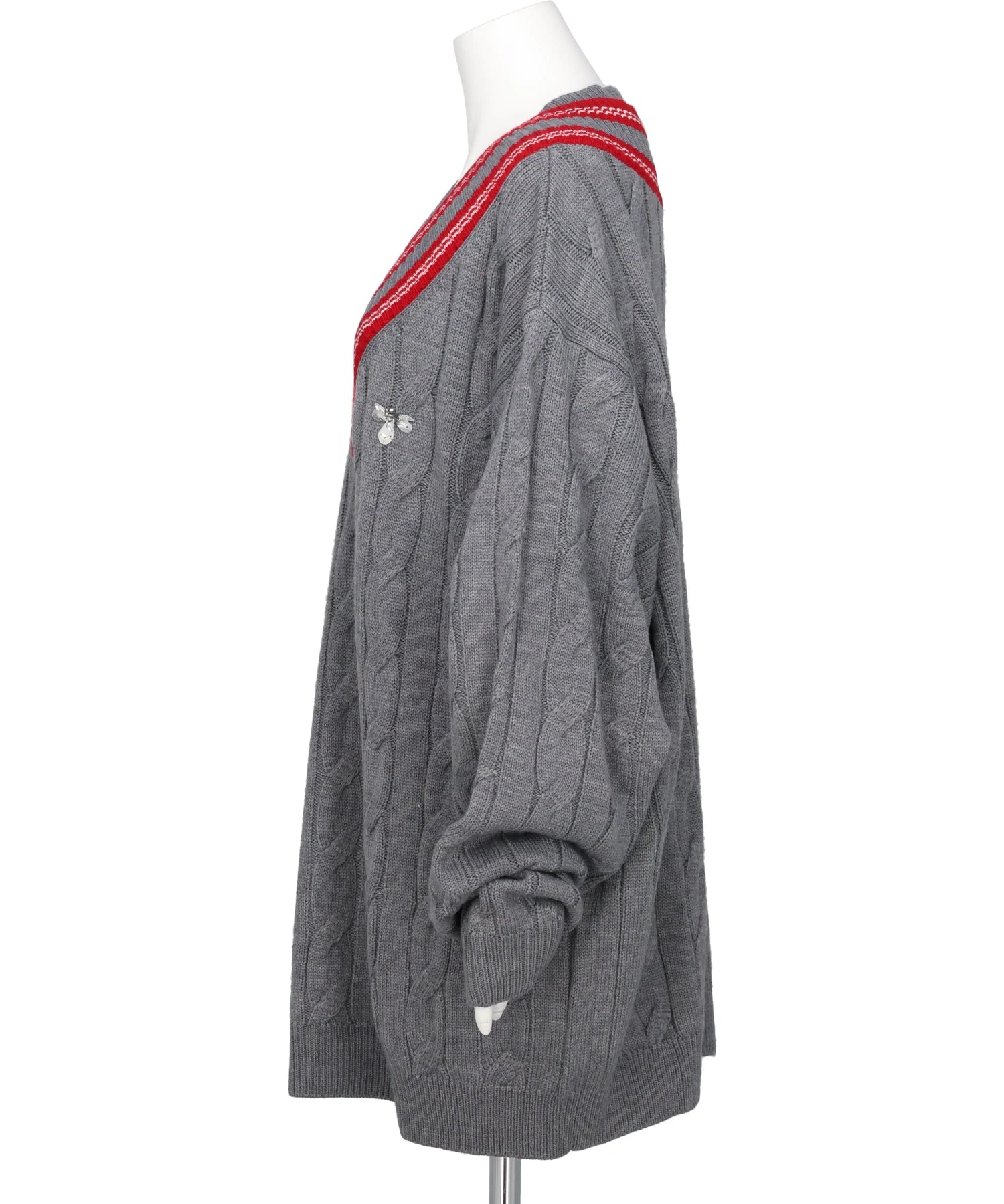 襟にシェブロンをイメージし、2重のライン を施したオーバーサイズのスクールニット。左胸には蜂のロゴをイメージしたビジュー刺繍を施しました。