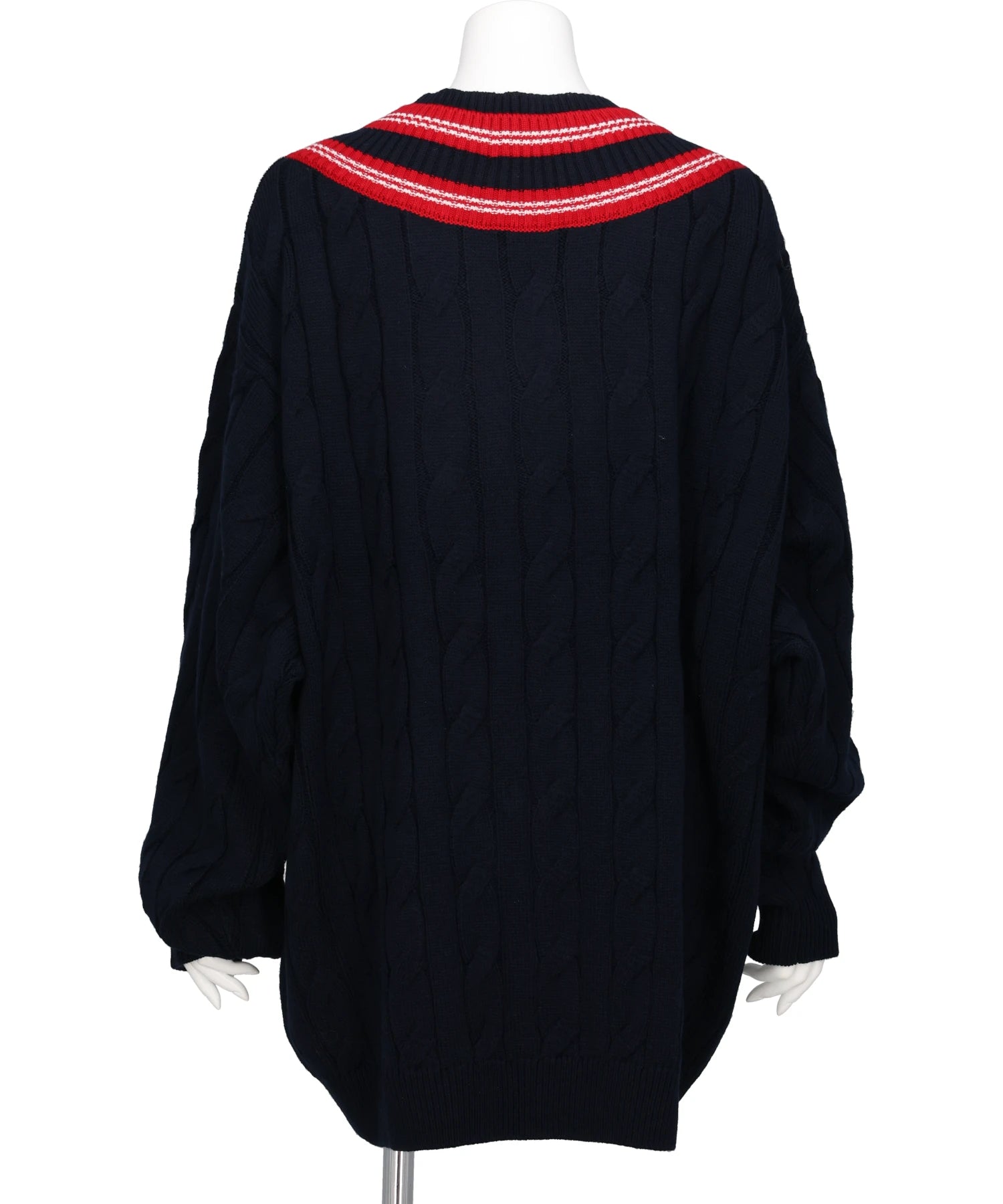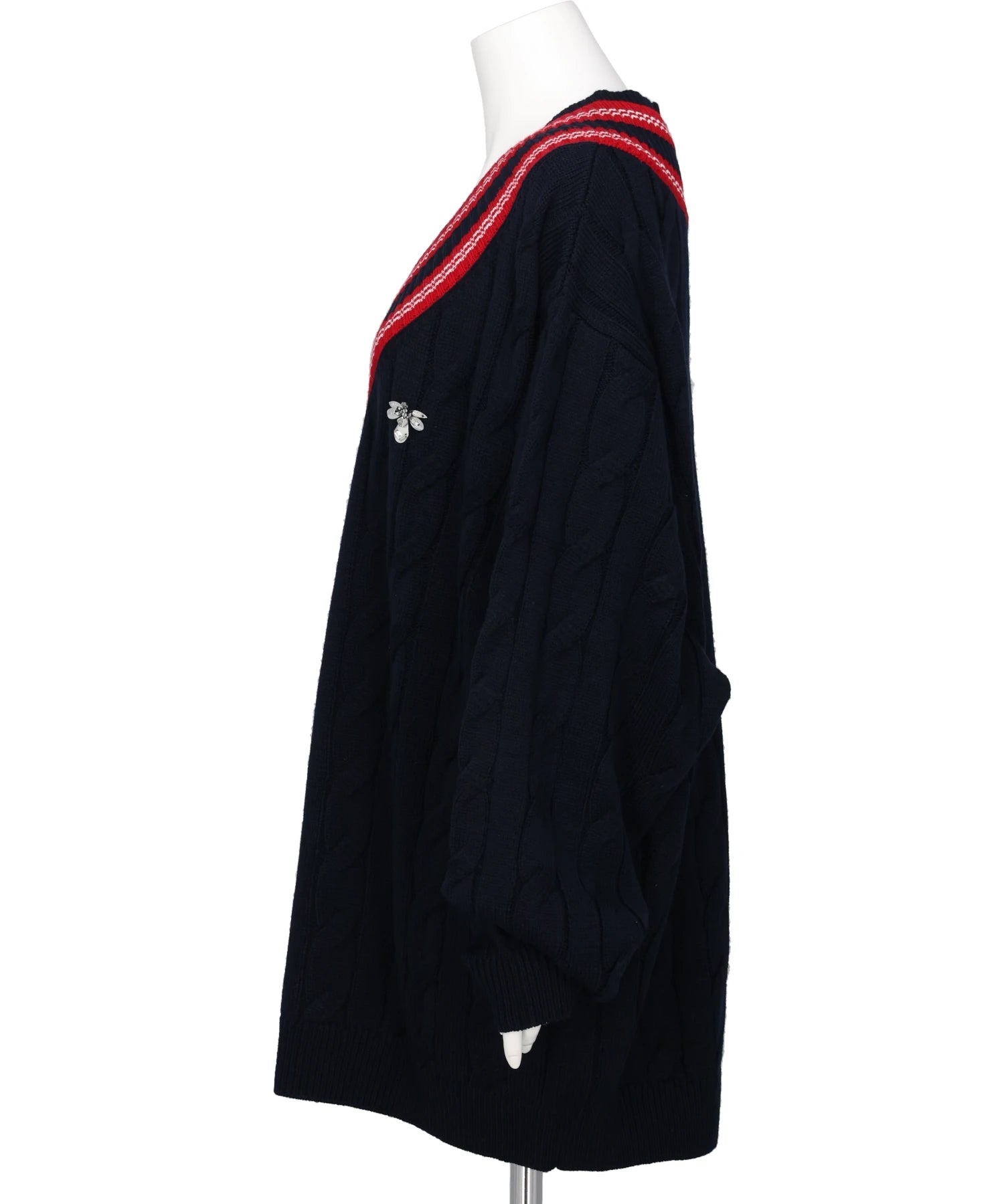 襟にシェブロンをイメージし、2重のライン を施したオーバーサイズのスクールニット。左胸には蜂のロゴをイメージしたビジュー刺繍を施しました。